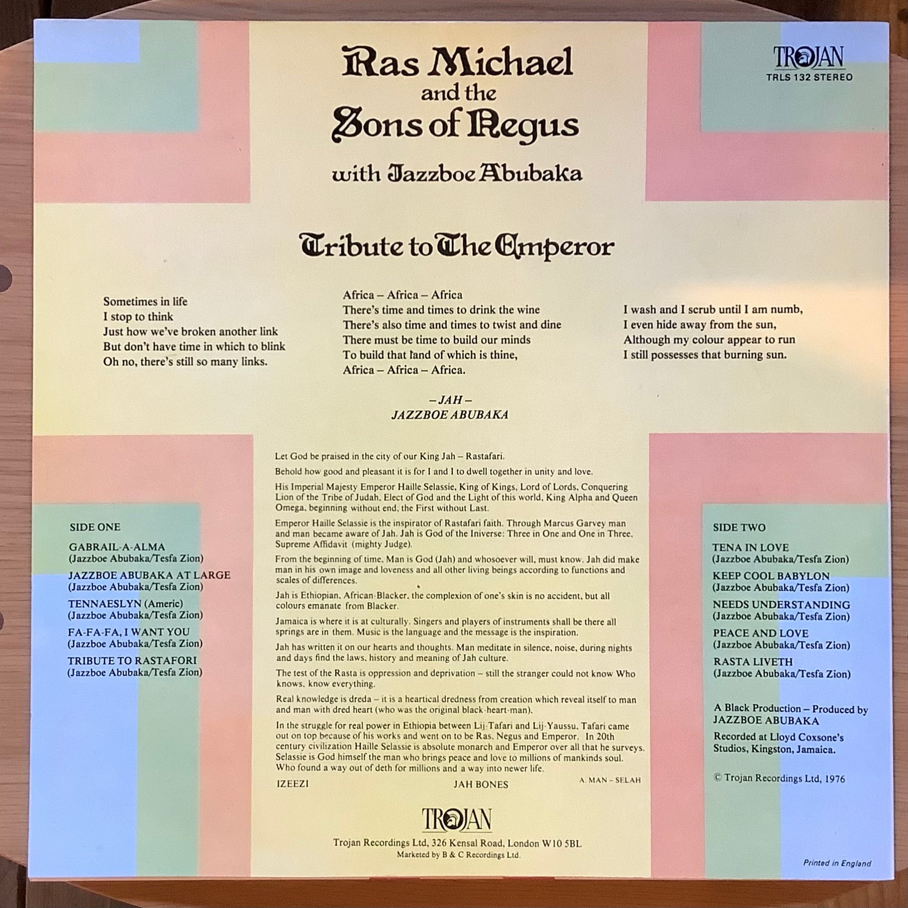 ジャマイカのラスタファリのコミュニティで育ち、そのラスタファリの宗教的儀式に欠かせない音楽NYABINGHIのパーカッション奏者の第一人者であるRAS MICHAEL。彼が自身のバンド THE SONS OF NEGUSとともにリリースした1976年の3rdアルバム。ゆったりとした太鼓のリズムに、オルガンやホーン、ヴォーカルが重なり、アフリカを想起させるプリミティブな音像が広がる。