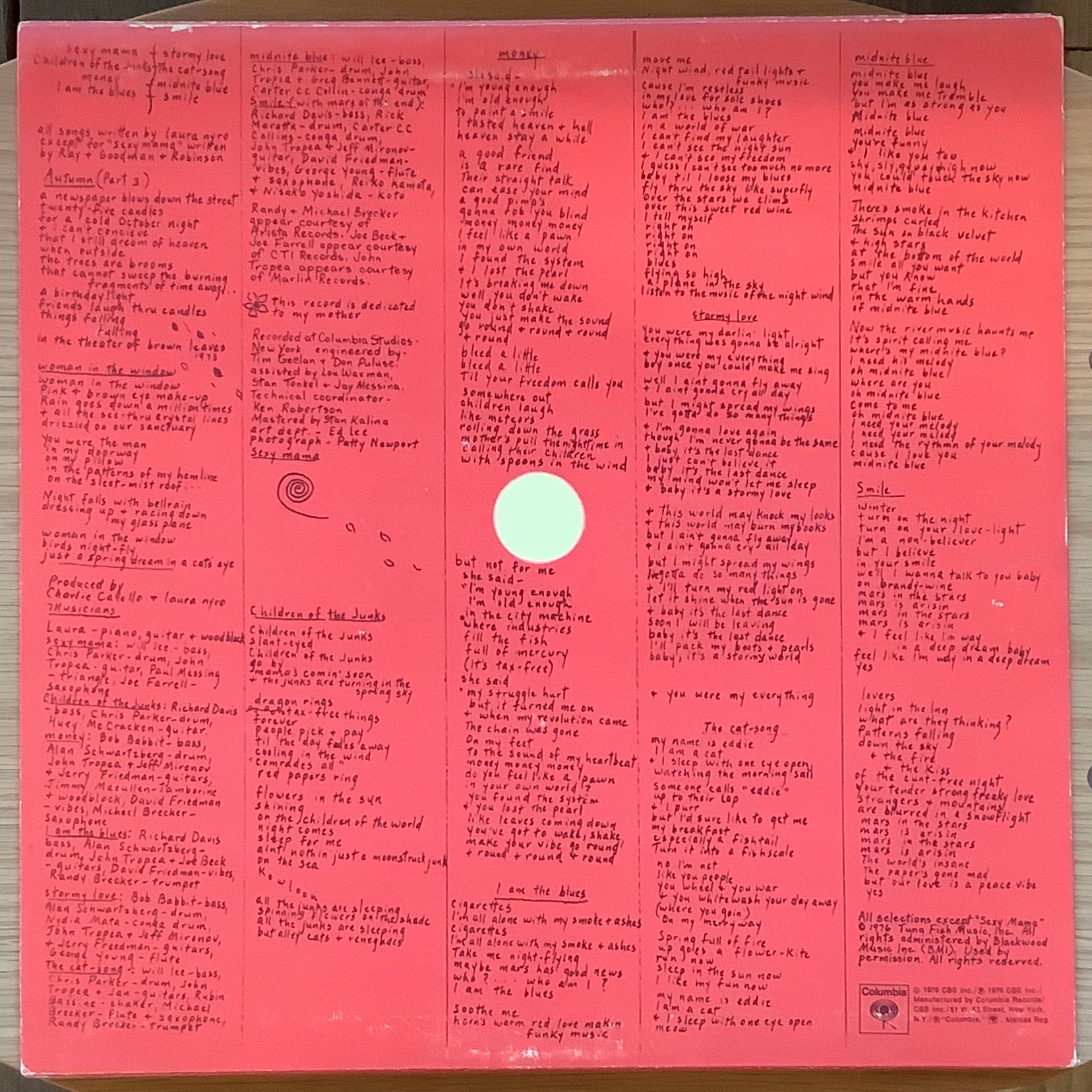 NY出身の女性SSW、LAURA NYRO。前作から5年のブランクを経てリリースされた1976年の6作目。BRECKER兄弟やRICHARD DAVIS(b)、DAVID FRIEDMAN(vibe)ら、ジャズ・フィールドのミュージシャンがバックサポート。MOMENTSのカバー「SEXY MAMA」や、「MONEY」等、ジャジーにアレンジされたメロウ・グルーブから、情感豊かに歌う「STORMY LOVE」、「THE CAT-SONG」まで、本作も素晴らしい内容。
