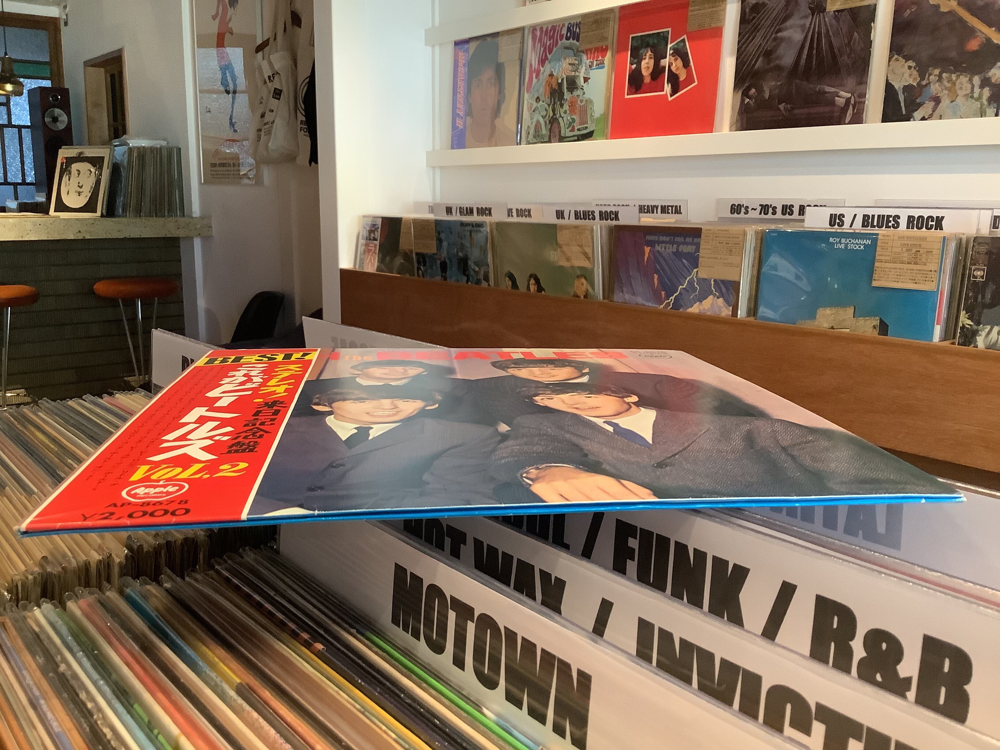 1963年リリースの2ndアルバム「WITH THE BEATLES」。1966年、来日を記念して、当時主流であったモノラルに対して、新しいステレオで、ジャケット、曲順を変更してリリースされた日本独自企画盤。こちらは1969年のリイシュー。赤盤。ペラジャケ。