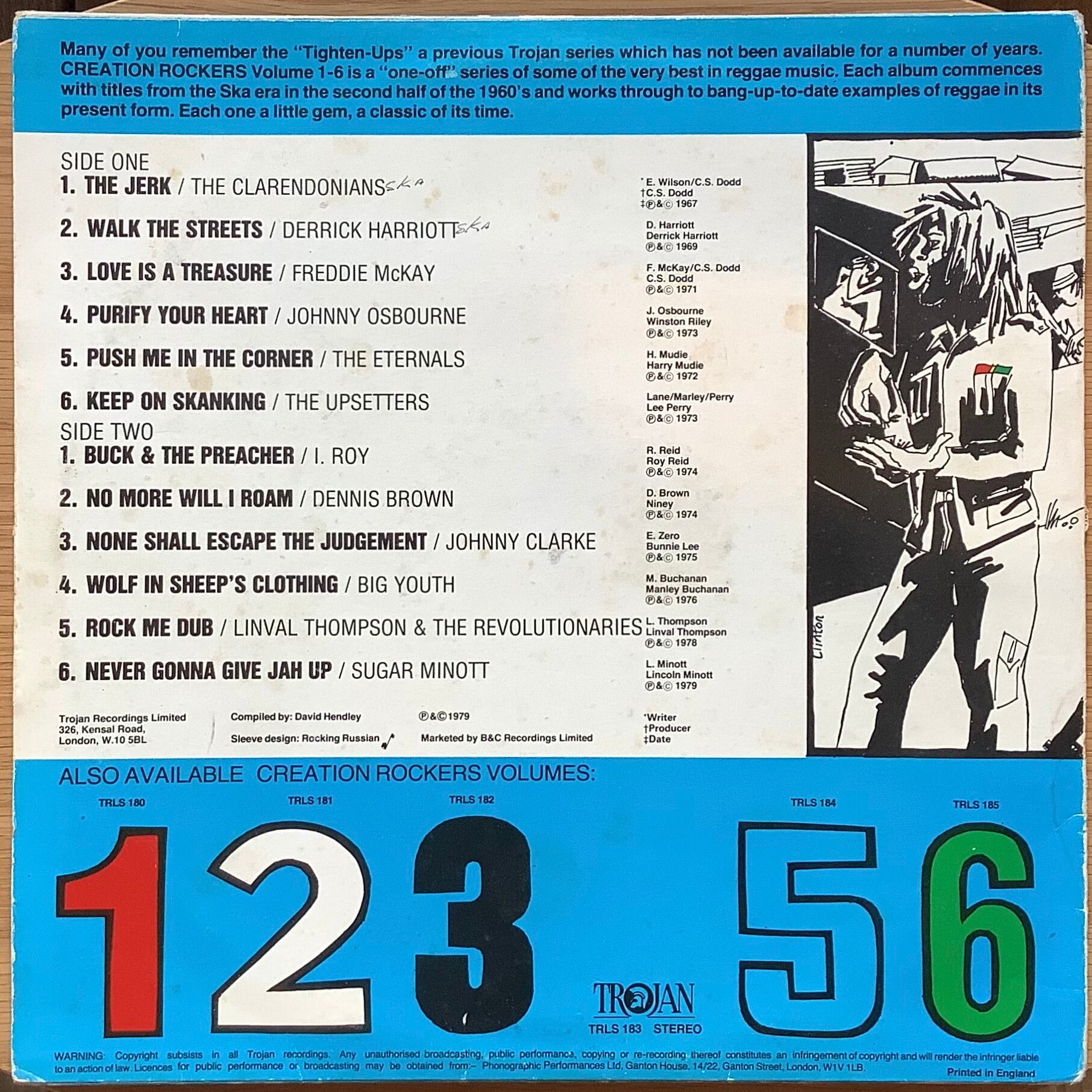 英国SKA、ROCK STEADY、REGGAE名門レーベル TROJAN。1979年に1回限りのシリーズとして、Vol.1~Vol.6までリリースされた名コンピレーション “CREATION ROCKERS”の第4弾。1960年代後半から1979年までの全ての時期を網羅した珠玉の12曲を収録。哀愁漂う、不良感たっぷりのEARLY REGGAE、深淵にはまり込むドープなEARLY DUBが充満した素晴らしい選曲。ジャケットのイラストも秀逸。