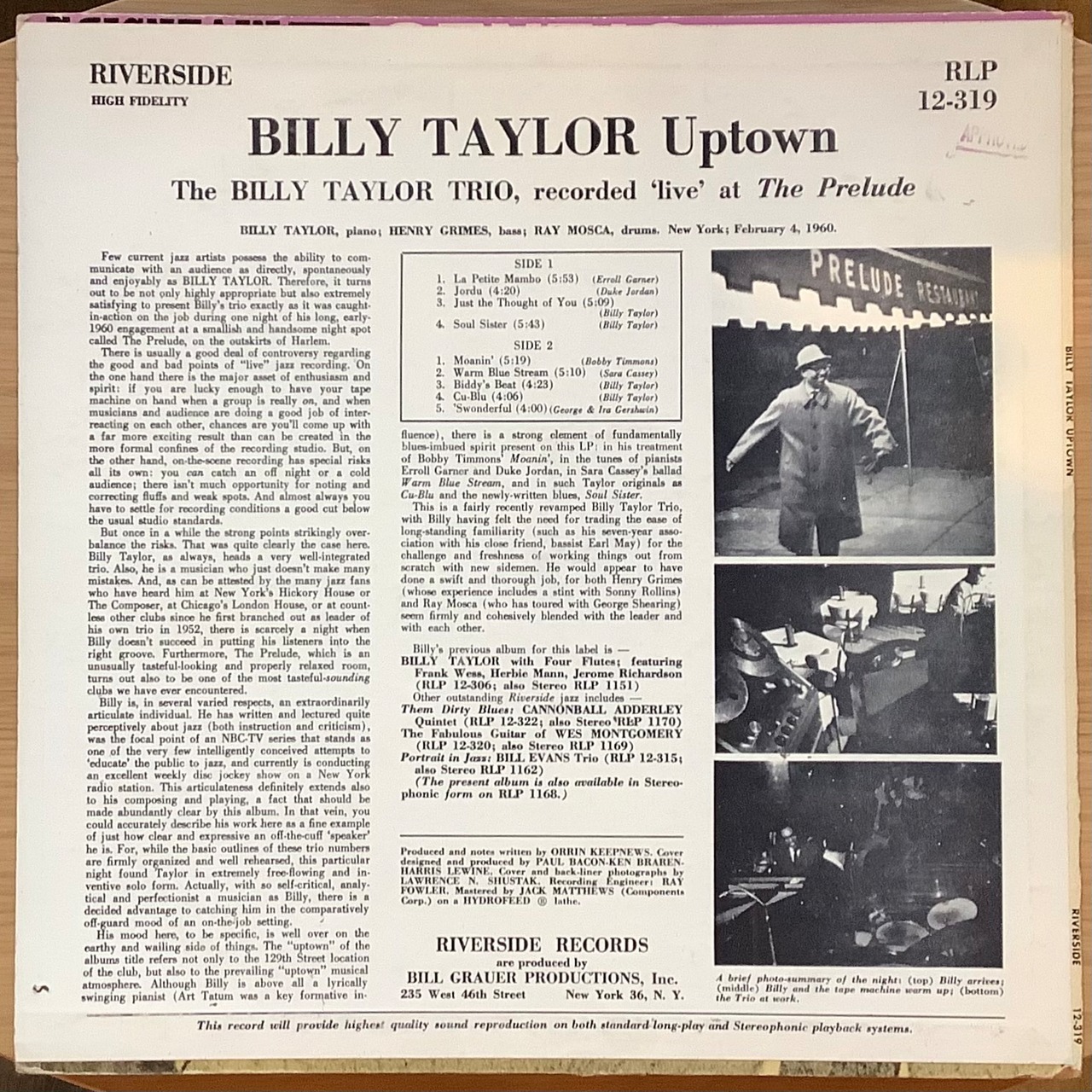 ジャズ・ピアニスト BILLY TAYLOR。1960年2月4日、NYのクラブ“THE PRELUDE”でのライブを収録。ピアノ・トリオでの演奏。ヒップでスウィンギーなピアノ・トリオ名演。「MOANIN’」等収録。