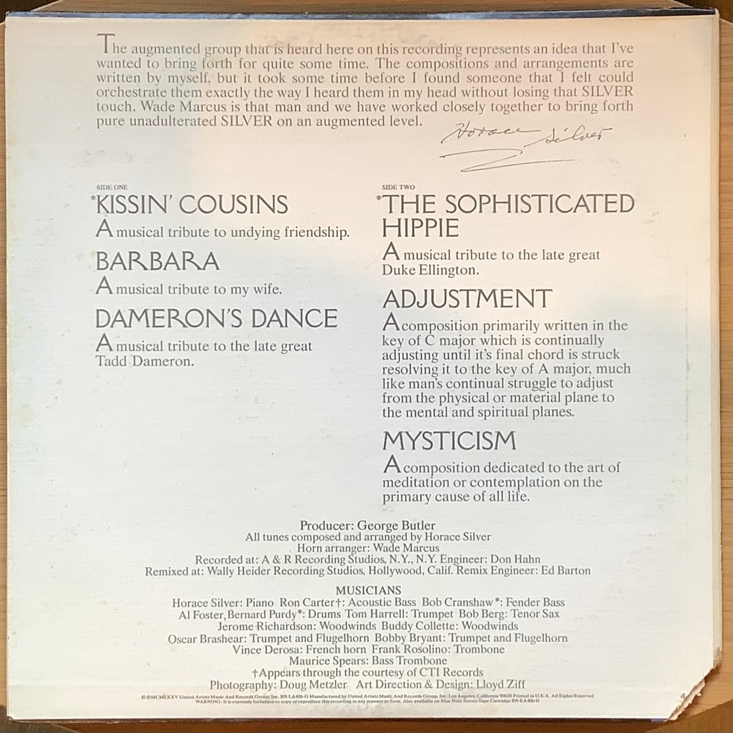 名門BLUE NOTEに数多くの作品を残す名ジャズ・ピアニスト HORACE SILVER。1975年リリース作。RON CARTER(b)や、BERNARD PURDY(ds)のリズム陣に、大勢のホーン隊が参加。洗練された軽やかなジャズ・グルーブ「THE SOPHISTICATED HIPPIE」等、ストレート・アヘッドなファンキー・ジャズを楽しめる。